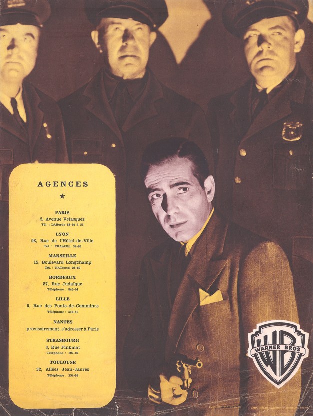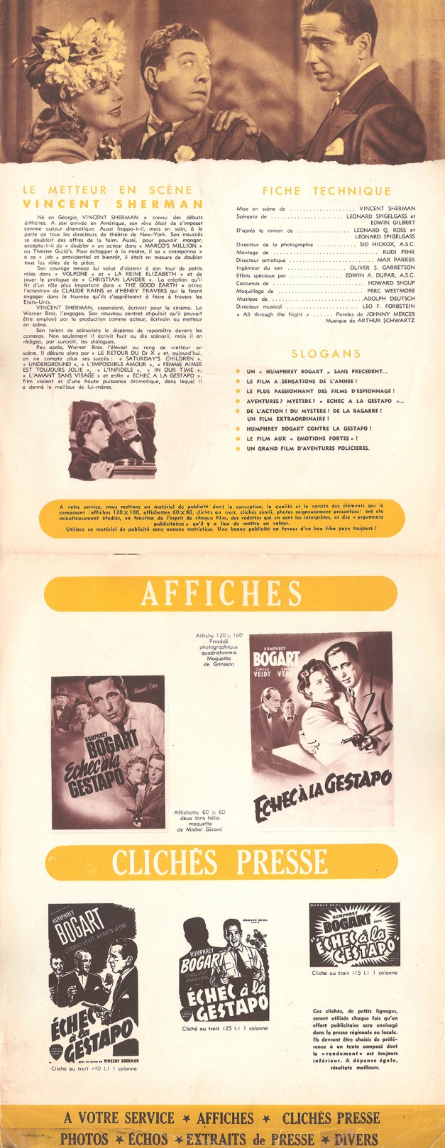 Dossier de presse très complet de la Warner. Film aux allures d’espionnage sortie après guerre en France. Bogart y incarne un gangster qui sera le héros de l’histoire, et partage l’affiche avec Conrad Veidt et Peter Lorre.