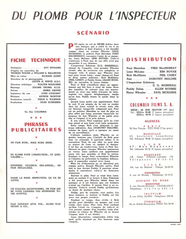 Du plomb pour l’inspecteur (Columbia, 1955). France scénario.