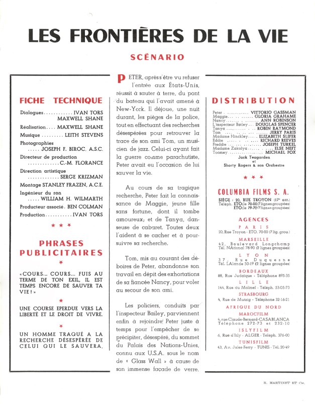 Les frontières de la vie (Columbia, 1954). France scénario.