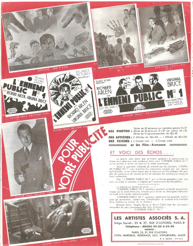 L’ennemi public N°1 (Artistes Associés, 1935). France DP.